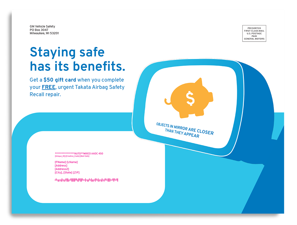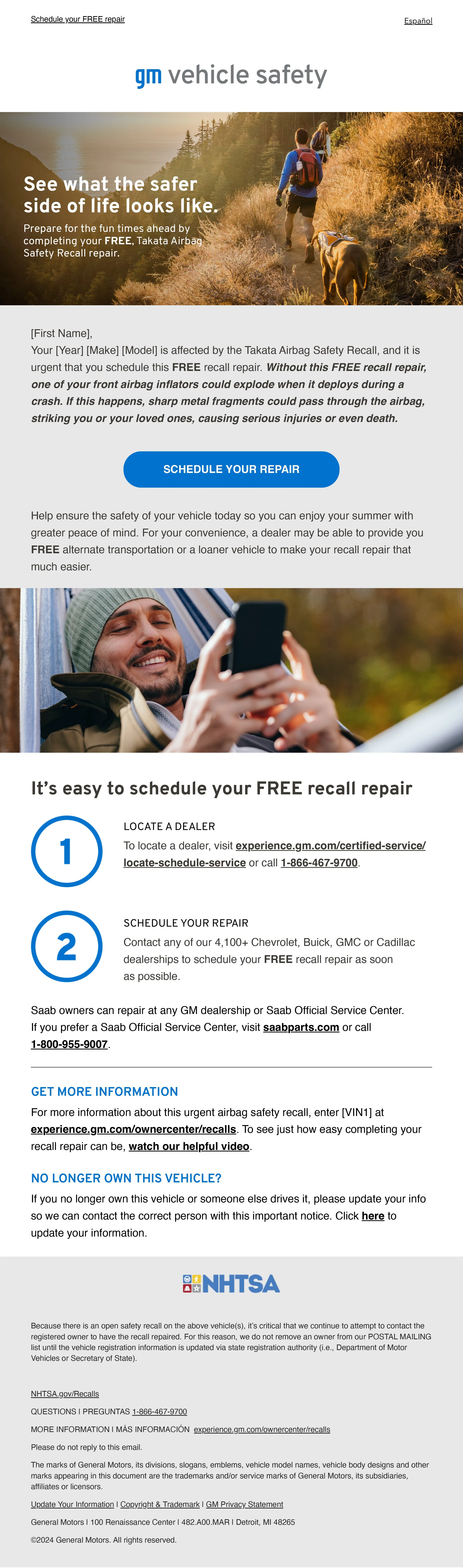 Project Overview. The Takata Airbag recall, one of GM’s most significant safety recalls, addressed airbags prone to exploding under long-term heat exposure: yet many vehicle owners ignored the warnings. My role was to create communication that not only captured attention but also made scheduling a recall repair seamless, helping more drivers take action and keep roads safer.